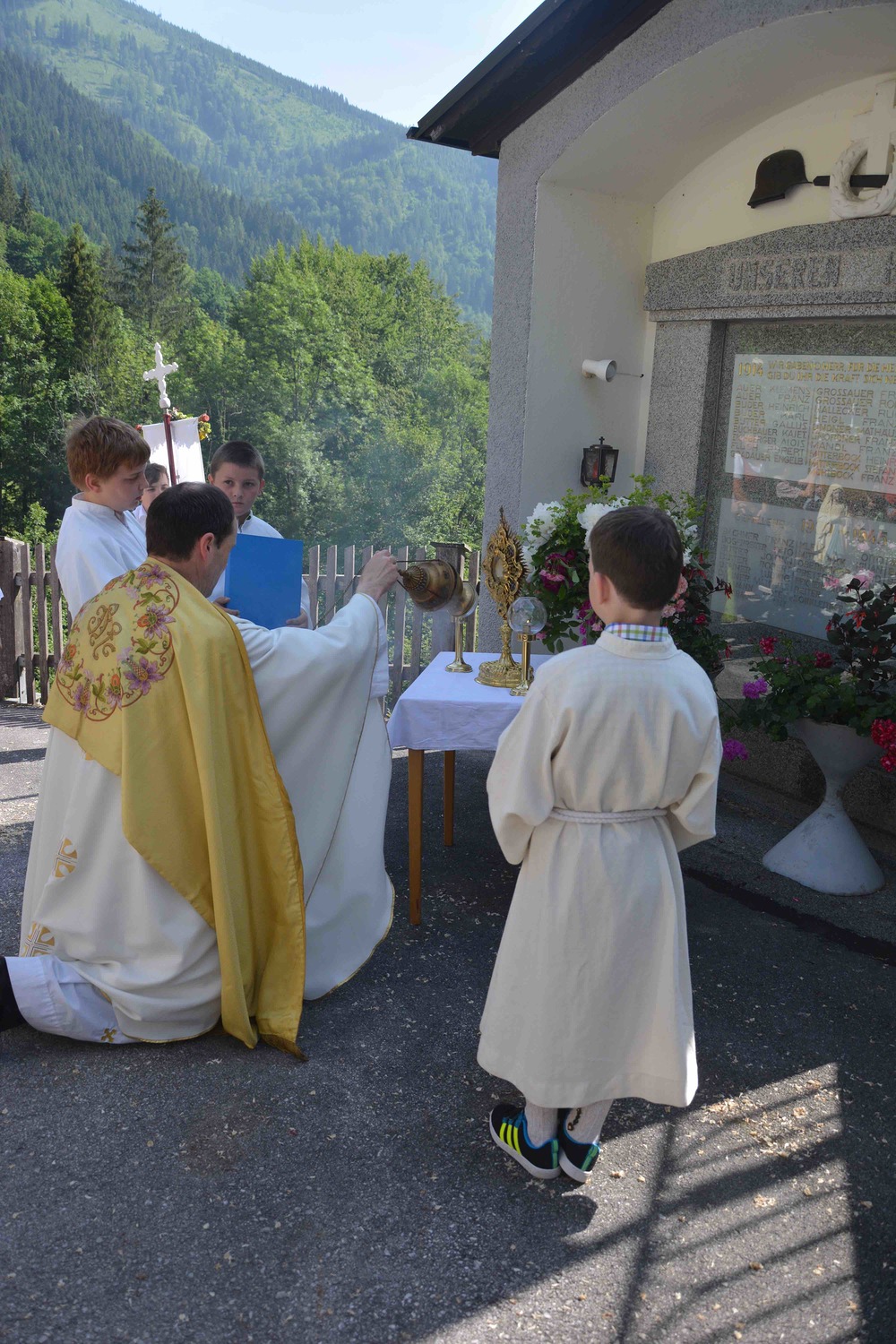 Bei wunderschönem Wetter wurde gemeinsam am 20.06.2019 um 08:00 Uhr das Fronleichnamsfest in der Pfarrkirche Palfau gefeiert. Die Messe wurde von der Musikkapelle Palfau feierlich umrahmt. Gestartet wurde mit einer gemeinsamen Festmesse in der Pfarrkirche, wo sich auch der 1. Altar befand. Angeführt vom Kreuzträger, der Musikkapelle, den Statuenträgern, viele Fahnenträgern, Pater Engelbert, den Ministranten, Laternen- und Himmelträgern zog die Prozession zum 2. Altar, der sich bei der Rinntaverne (Fam. Pechhacker) befand. Der 3. Altar war beim Holzknechtkreuz und der 4. Altar beim Kriegerdenkmal. Ein herzliches Dankeschön gilt Pater Engelbert für die feierliche Prozession und der Musikkapelle für die feierliche Umrahmung. Vielen Dank an ca. 20 Kinder aus Palfau, die mit Fahnen und Statuen das Fronleichnamsfest sehr bereichert haben. Danke an alle die beim Kirchenschmücken, beim Herrichten der wunderschön geschmückten Altäre mitgeholfen haben und an alle Mitwirkenden.